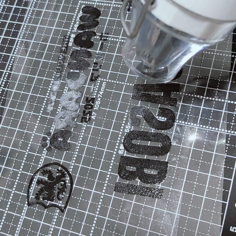 レジン作家らしく、エンボスヒーターで乾かしました。乾くと黒い部分に残っていた紙の繊維が白くなりますが気にしなくて大丈夫です◎