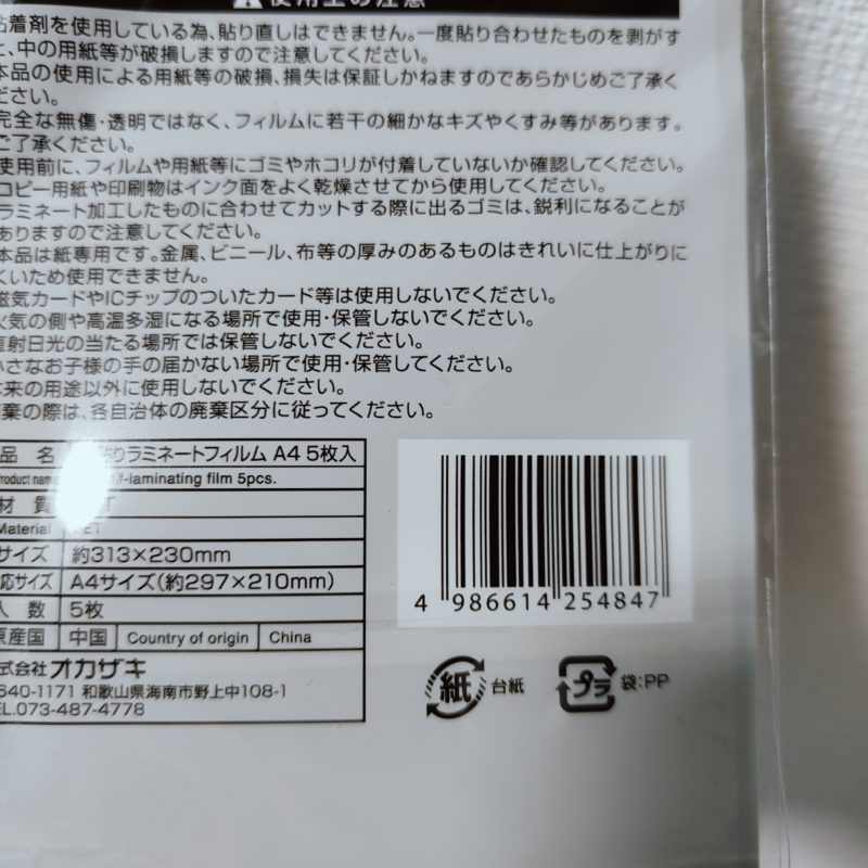 手貼りのラミネートシートA4サイズ。5枚も入っているので失敗を恐れずチャレンジできていいですね。失敗したときのために印刷も2セットしましたし。