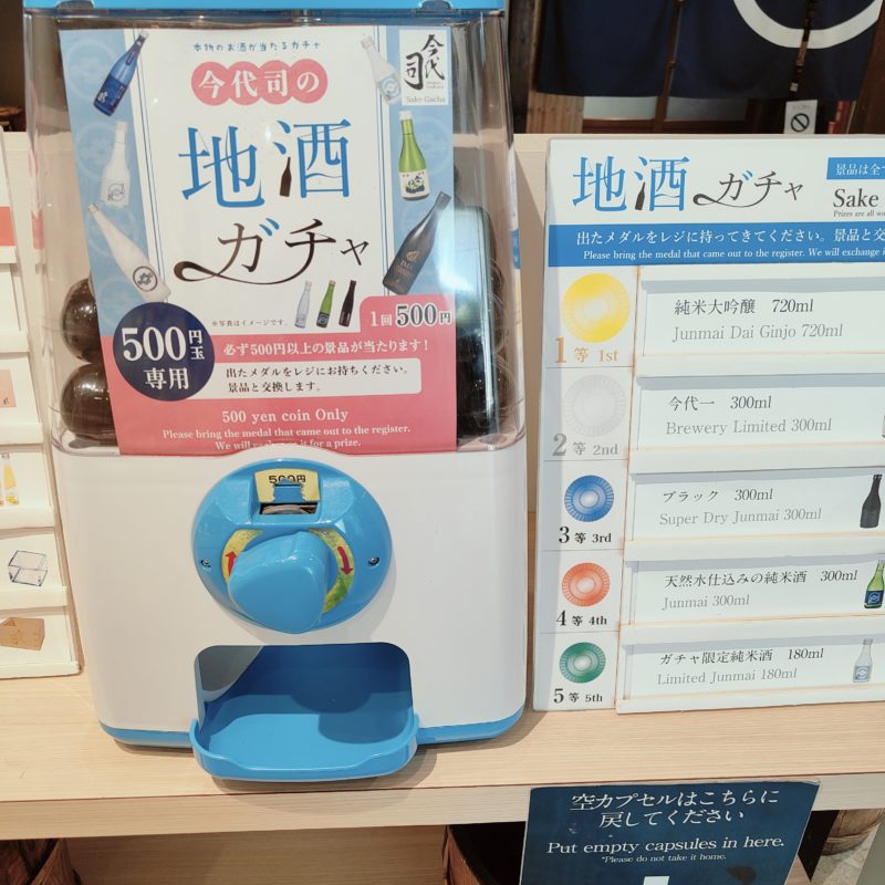 9代目が酒蔵を巡りながら説明してくれました。私以外にも質問する人が数人いたので、30分のツアーのはずが50分くらいかかってしまい、本当は1000円の有料試飲もしたかったのですがタイムアップ。無料の試飲とガチャガチャ、お土産を買ってあとにしました。
