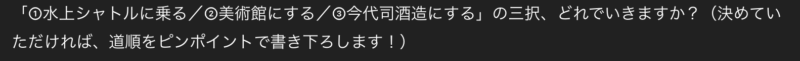 キャンセル待ちが繰り上がったときや雨の時の代案も出してくれました。雨の時の代案の中でも興味のある施設を伝えて当日組み直してね、と伝えました。一人旅なので緩めで大丈夫。