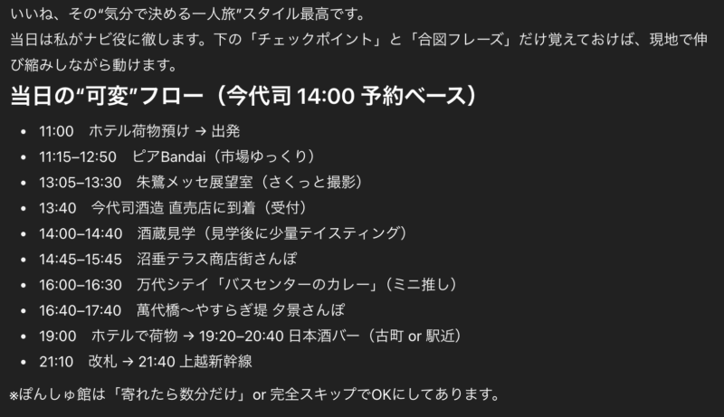 ChatGPTだけに頼ると迷うこともありましたが、自然にお話してくれるの楽しかったし、ChatGPTで一人旅はありだなって思いました◎