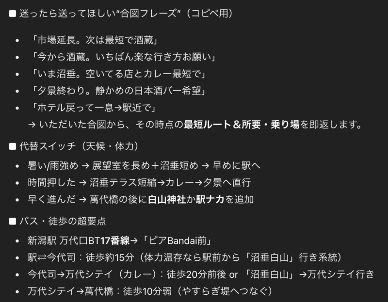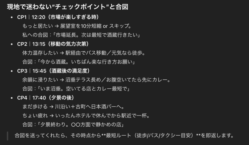 当日の合図や、持ち物も頼まなくても出してくれました。ツアコンGPT、準備編はとても優秀です。