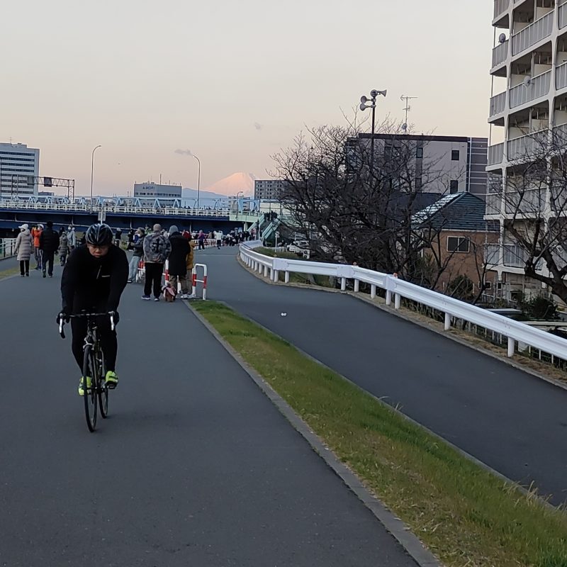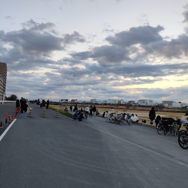 東京に戻ってきて、各家を回りながら帰路につく途中、そろそろ日の出じゃないかというタイミングで土手があったので上がってみました。地元風の人がたくさんいたので日の出スポットではあるみたいです。
