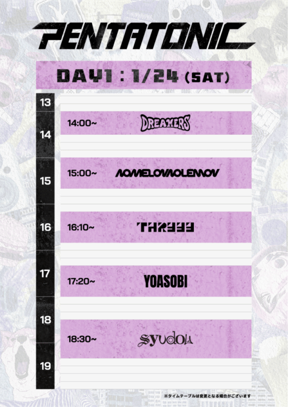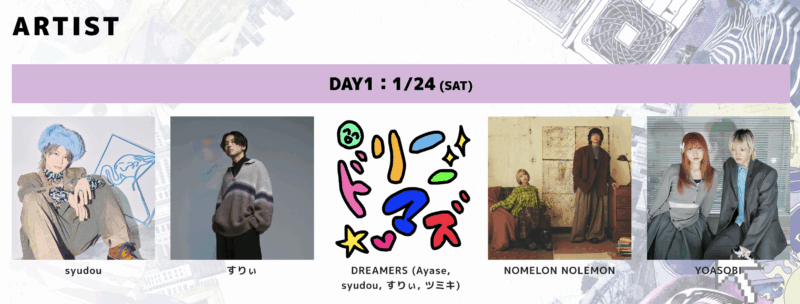 前後しますが、初日の出演者です。キュレーターのshudouさん、すりぃさん、NIMELON NIMELON、YOASOBI、DREAMERSの5組です。イベントタイトルのPENTATONICが5つの音という意味なので、5組出演。