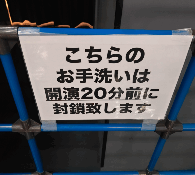 前々回のこけら落としのとき、スタンド席下段端にお手洗いがあった気がすると思って開演前に向かったのですが、誰も並んでなかったです。というか、男性が多かったので女子トイレそこまでほかも混んでなかったのかもしれませんがそれにしてもがら空きでした。