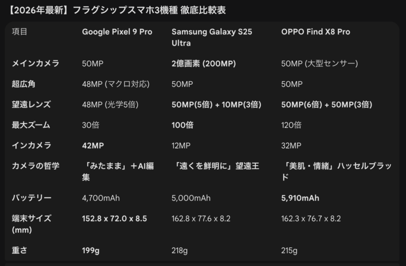これだけで比較すると、OPPO Find X8 Pro凄いなと思います。バッテリーの大きさもいいし。ただ、この中で中古市場を比較したときに、10万円程度で買えるのは今のところ、pixel 9 proでした。 Pixel 10 proのみどりも可愛いですけどね。